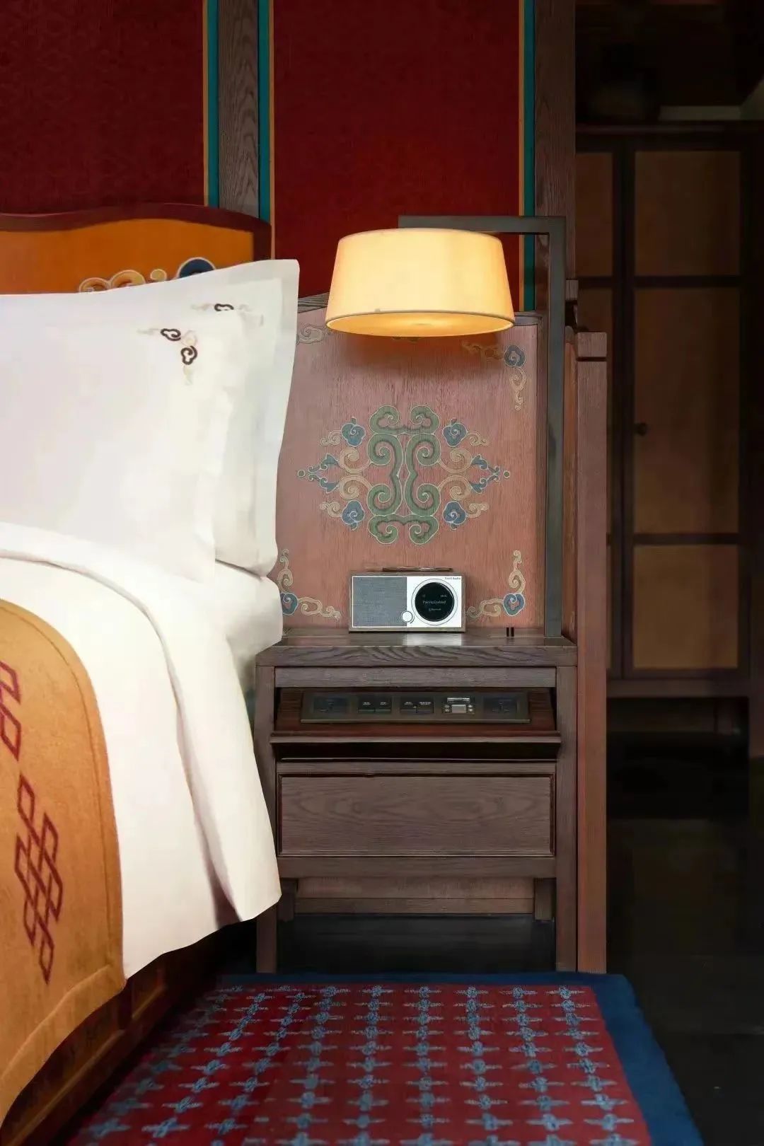 壁爐設計、藏族器皿工藝品陳列、高飽和度色彩的民族特色繪畫與地毯點綴,為質樸典雅的室內空間注入了藏式風情內核,致敬源遠流長的藏族歷史文化。